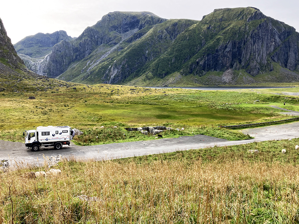 Pour l’anecdote, nous avons pris notre premier ferry entre Revsnes et Flesnes. Chanceux, nous sommes arrivés pile au moment de l’embarquement et il y avait de la place pour nous. Bidouille a trouvé cela tellement chouette d’avancer sans bosser qu’il a refusé de descendre à l’arrivée ! Plus de batterie ! En fait, la batterie de la cellule était trop déchargée. Quand nous l’avons connectée à l’alternateur, la batterie camion, voyant sa copine en détresse, lui a refilé quelques ampères. Résultat, quand on a voulu démarrer, pas assez de tension. Evidemment, week-end, et sur une île paumée, impossible de trouver un booster 24 V. Heureusement, Jeff, prévoyant, a dans la soute, un chargeur de batterie. Les marins nous ont trouvé une prise en 220 V. Après 3 aller-retours, la batterie avait suffisamment repris des forces pour bosser. C’est une bonne leçon, on fera attention la prochaine fois !