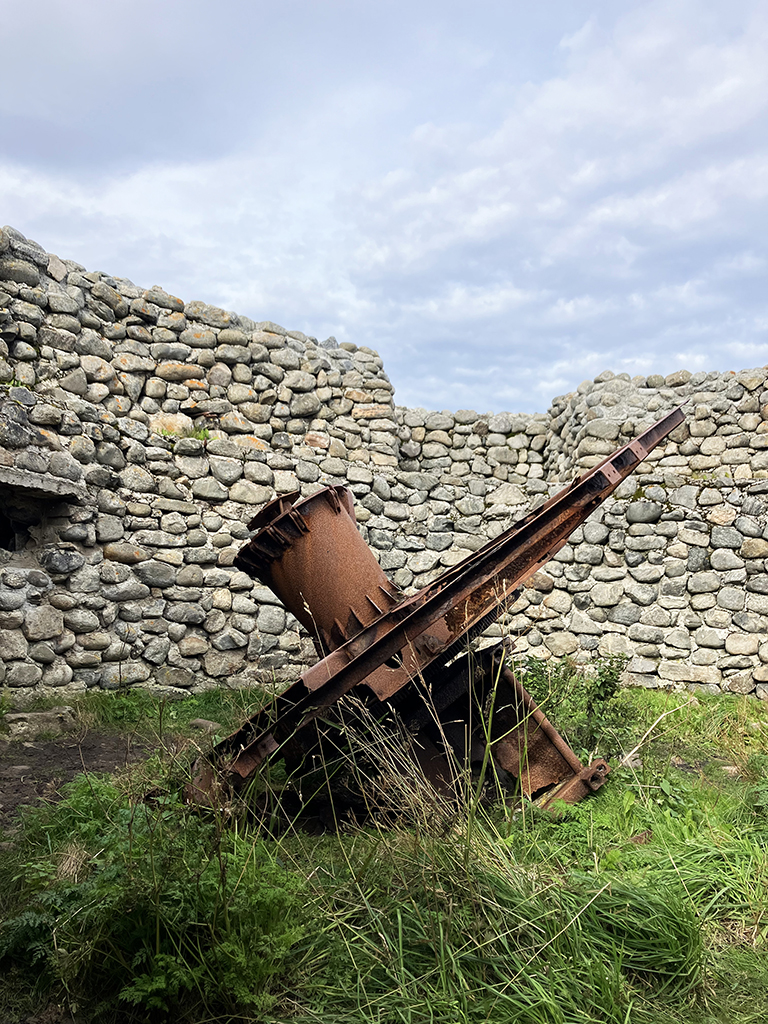 Tout au bout de la route, il y a une petite construction en gros galets. Les Allemands avaient construit, entre 1943 et 1944, un radar pour détecter les convois de ravitaillement que les alliés envoyaient à l’armée rouge. Ces convois passaient par le Cap Nord pour arriver à Mourmansk. Détectés aux Lofoten, les convois pouvaient être coulés par le cuirassé Tirpitz basé plus au nord ou par les U-boats.