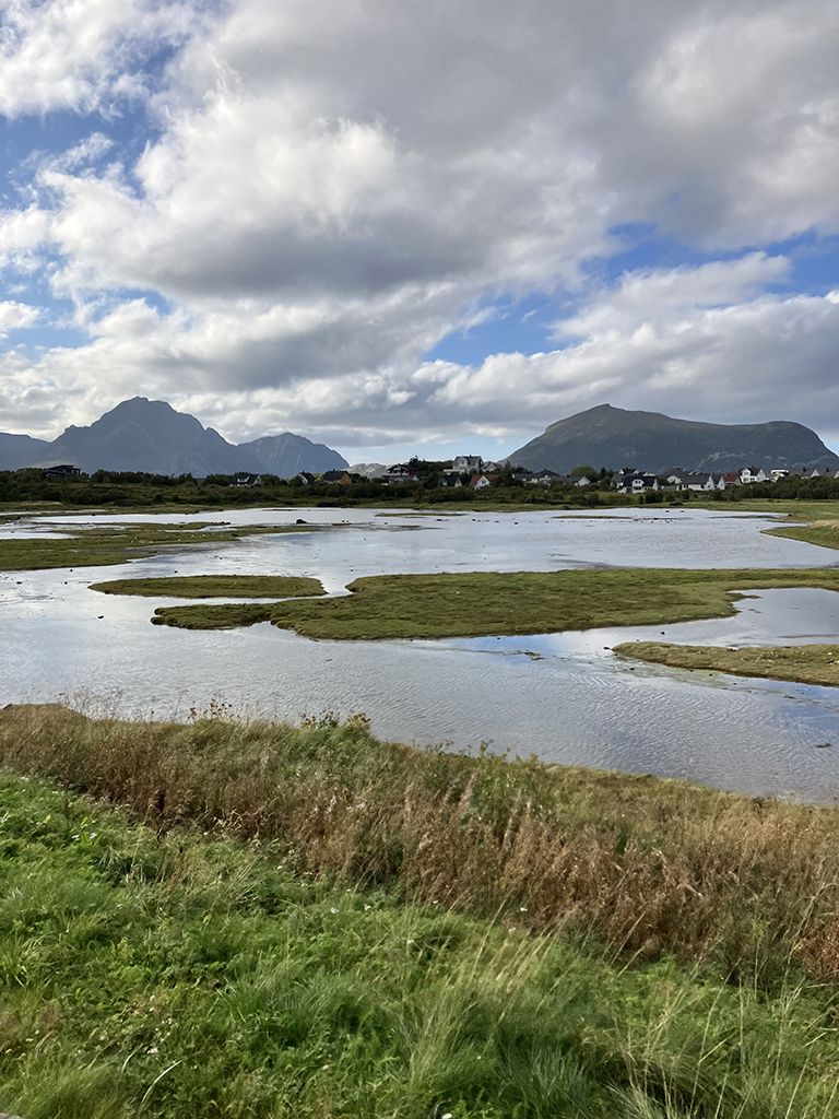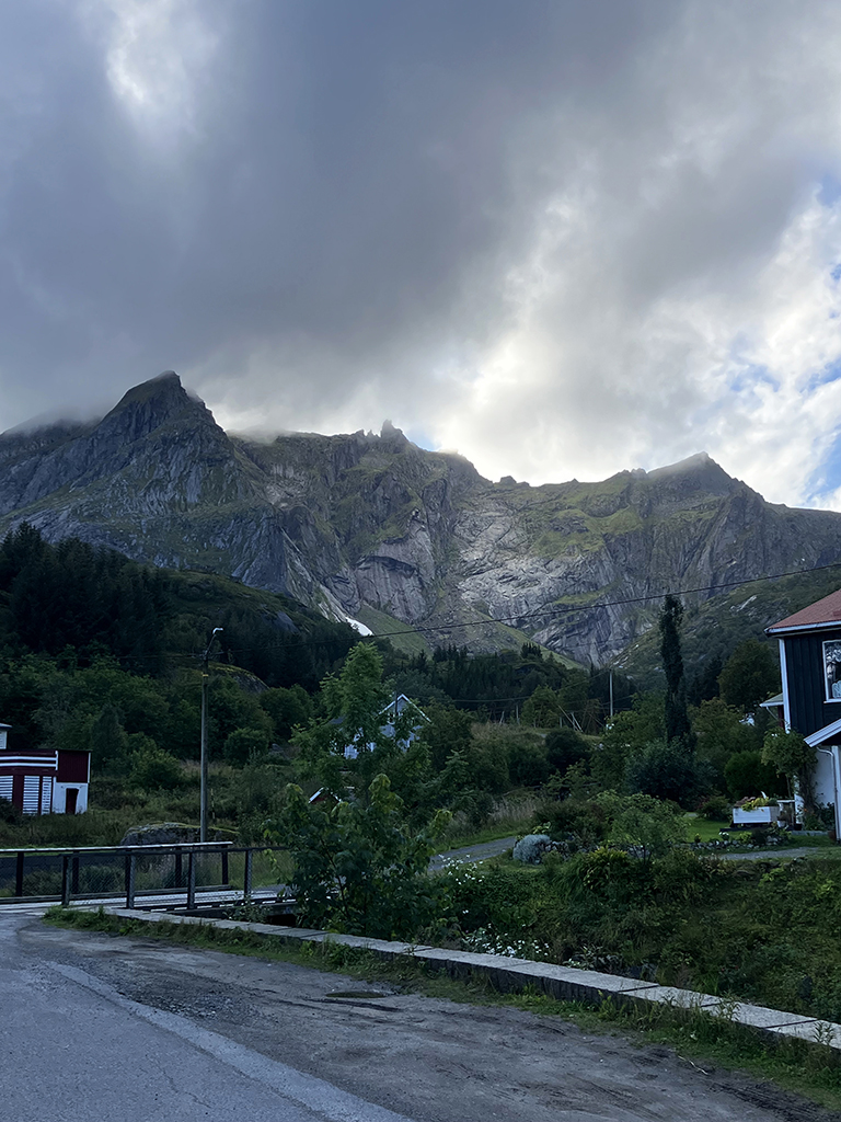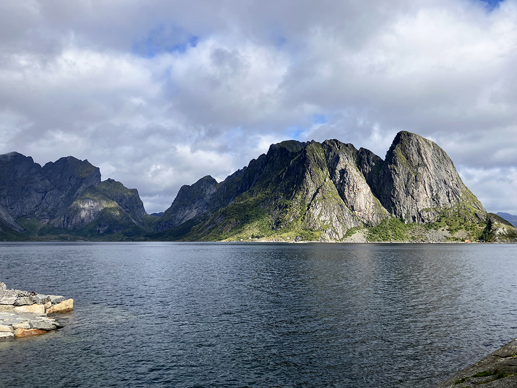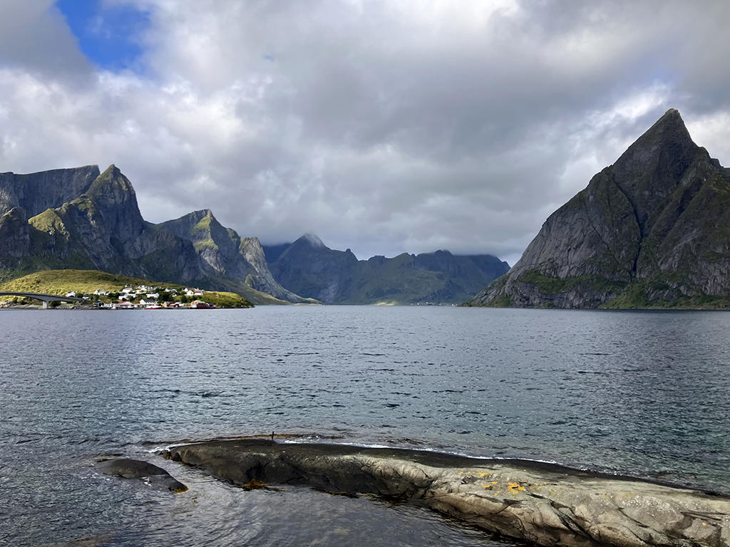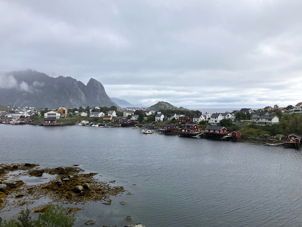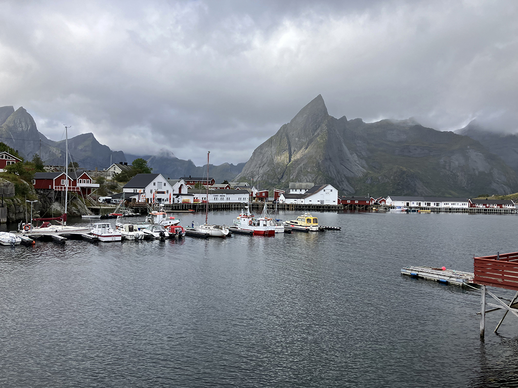 Le temps est encore au gris. Pas de pluie mais les montagnes ont accroché les nuages et elles se cachent. La route est étroite et il y a énormément de camping-cars et de caravanes. Pas cool pour le chauffeur qui doit viser les bas-côtés plus larges pour croiser. Sur les parkings des points de vue, il est impossible de s’arrêter. Bref, trop de monde pour nous ! Il faut dire qu’il n’existe qu’une route pour parcourir les îles Lofoten. Et comme c’est « the place to see » en Norvège la densité de touristes est impressionnante. Je n’ose l’imaginer pendant la saison ! Les Lofoten, c’est un archipel composé de 6 îles reliées par des ponts ou des tunnels sous-marins ; Austvagoy, Vestvagoy, Flakstadoy, Moskenesoy, Sakrisoy, Hamnoy, plus des îles plus lointaines au sud, Vaeroy et les Rost. Les îles sont très urbanisées. Jolis ports, maisons de couleur, entourés de montagnes (quand on les voit ) cela doit avoir un certain charme sous le soleil. Pour ma part, je préfère Senja ou les Vesteralen, beaucoup plus sauvages.