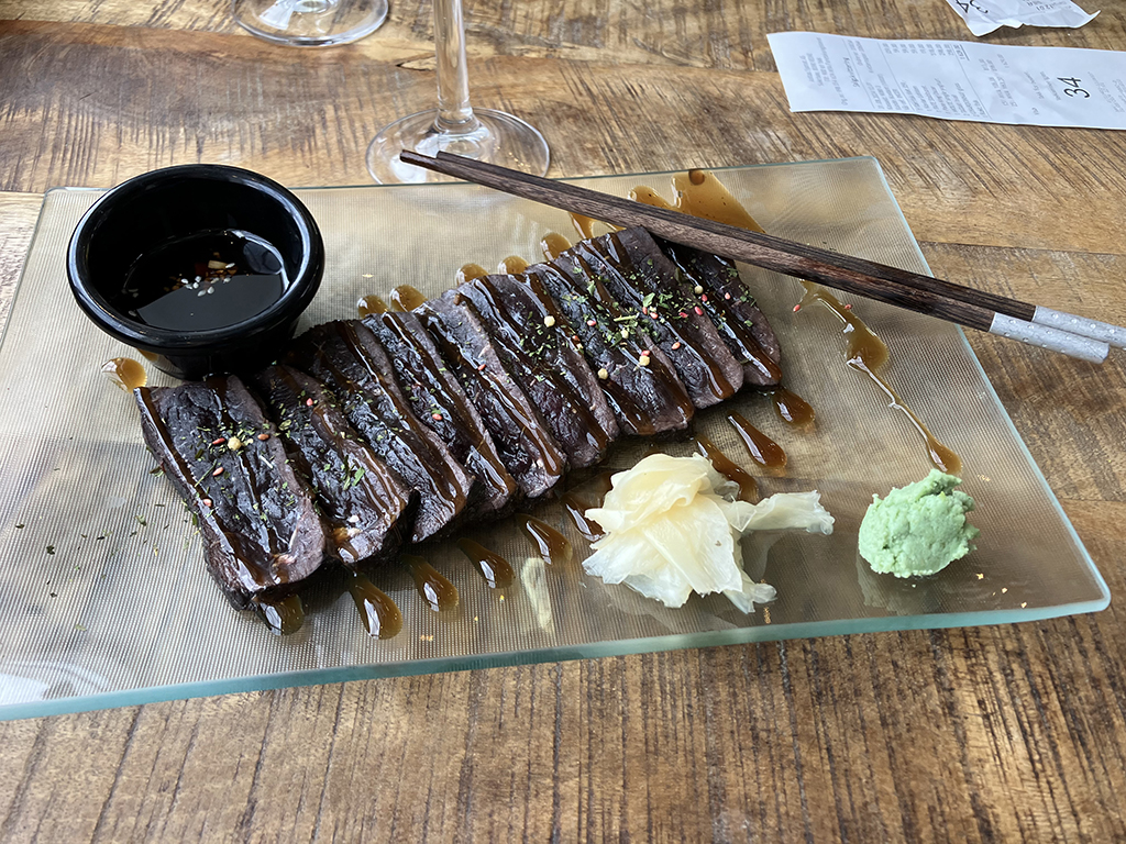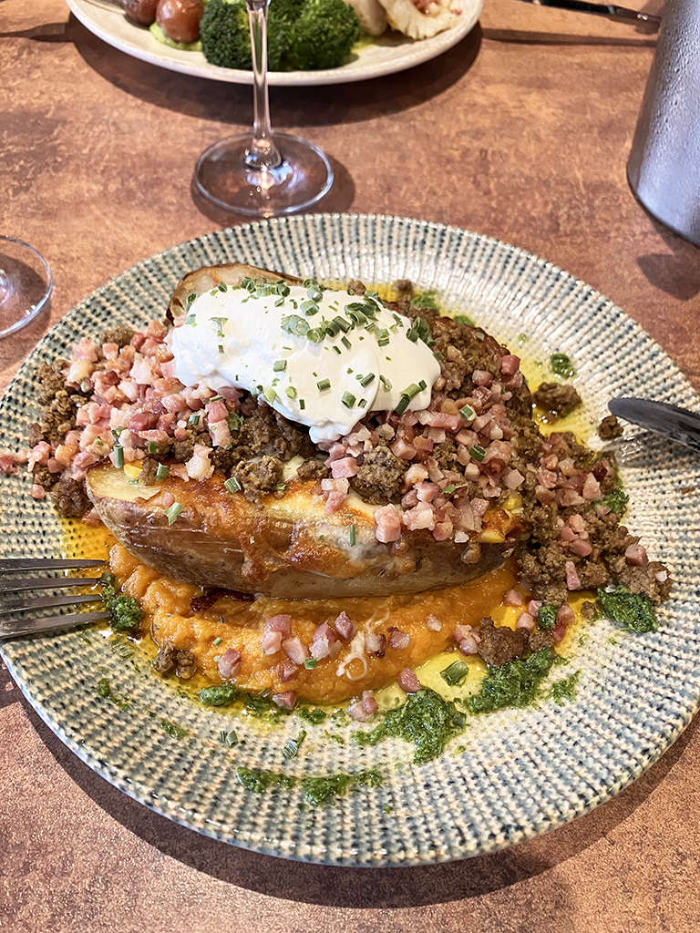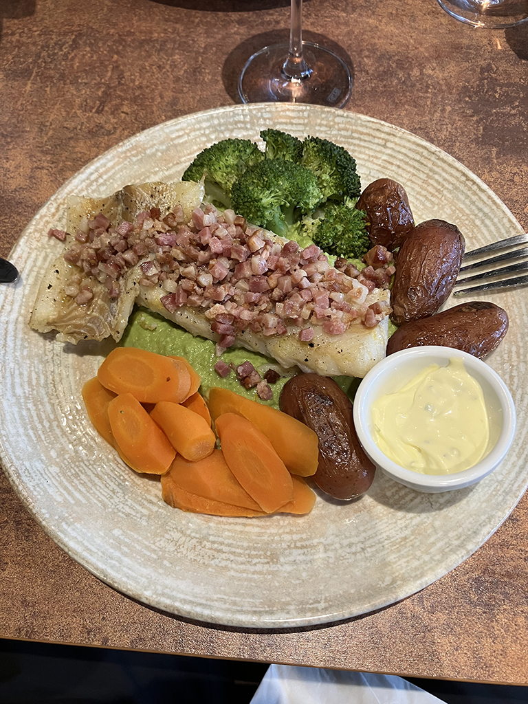 Carpaccio de baleine, stockfish (cabillaud séché) et pommes farcies. Les portions étaient copieuses, sauf le carpaccio. Les restaurants sont très chers en Norvège, cela limite nos excursions dans la gastronomie norvégienne.
